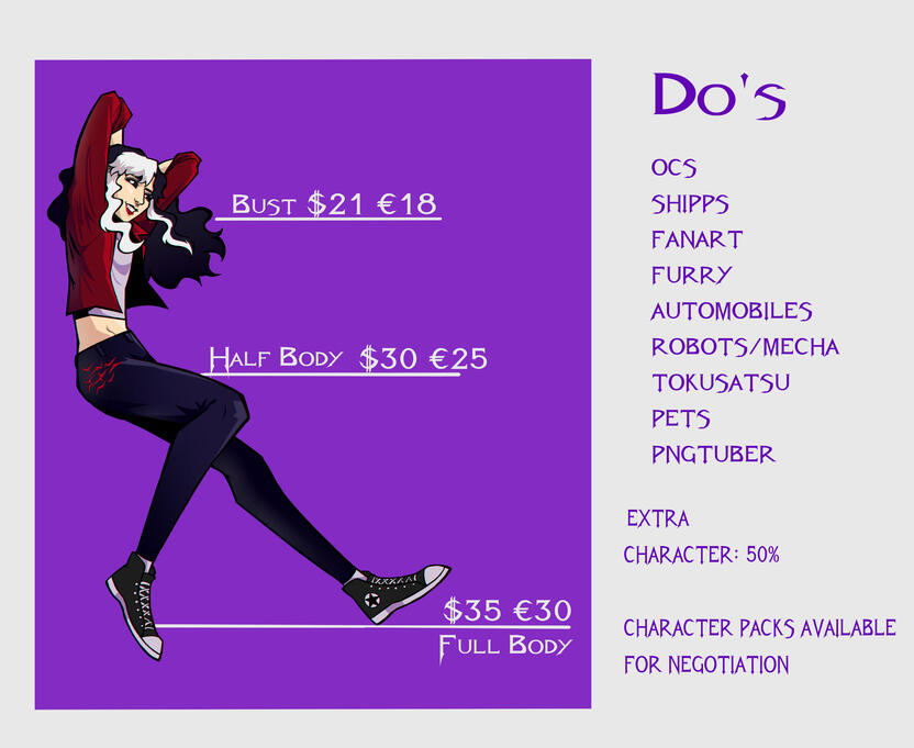 PAYMENT AND REFUND - Artwork will not begin until payment is received. - Payment via Paypal, with proof of payment sent via DM before starting the artwork. - Payment can be 50% after draft approval and 50% before delivery of the final artwork, or 100% after draft approval. - Depending on the complexity of the artwork (type, details, and objects), the price may increase. - If the artwork is already in progress and is canceled, you will receive 50% of the amount paid at the time of draft approval.EXTRA CHARACTERS - Additional character: 50% of the total value. - Orders larger than 3 characters are open to negotiation of character packages.DEADLINE - Delivery time varies from 2 weeks to 1 month and may be extended depending on the complexity and quantity of artwork. - If you want the artwork ready by one specific date, please notify in advance - In case of a tight deadline, a fee will be addedREFERENCES - Before ordering, ensure you have the necessary references to show exactly what you want; telling more about the characters can also help create artwork with a unique personality!PROCESS AND CHANGES - The process has 4 stages: sketch, line art, base colors, and render, all duly shown to the client.- Changes to the pose, character, background, etc., are allowed in the sketch stage; only minor changes will be allowed once the line art begins, at no additional cost.GENERAL TERMS - I will post the artwork on my social media, however the client has the full right to request privacy if notified beforehand. - High-resolution artwork sent via Google Drive; if you prefer it via email, please notify me beforehand. - I do not create NSFW, character design, gore, or proshipp artwork.USES AND CREDITS - A commercial fee will be included only for products (ex: bottons, keychains, etc.). - Artwork for YouTube channels, Twitch, and other platforms is permitted with proper credit. - The use of my artwork in icons/pfp, banners, and social media posts is only permitted with proper credit. - The use of my artwork by AI or NFTs is strictly prohibited.
